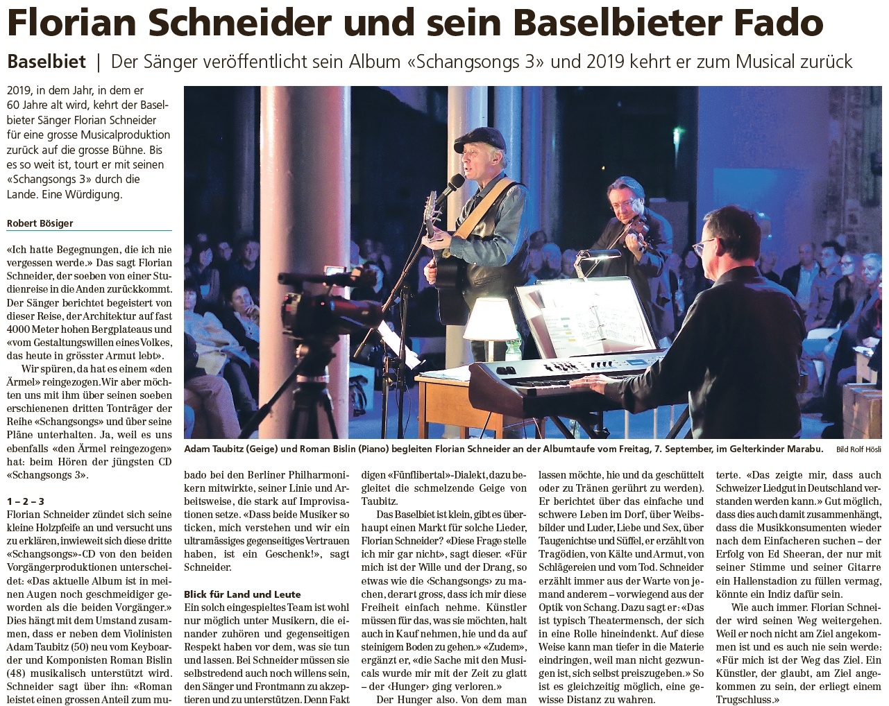 2019, in dem Jahr, in dem er 60 Jahre alt wird, kehrt der Baselbieter Sänger Florian Schneider für eine grosse Musicalproduktion zurück auf die grosse Bühne. Bis es so weit ist, tourt er mit seinen «Schangsongs 3» durch die Lande.